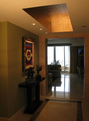 Otras imágenes de los efectos luminosos logrados con la técnica antigua de la yema de huevo. Este techo ovalado tal parece abrirse a un cielo en Key Biscayne amanecer. La cenefa que reviste el borde del espacio ovalado también es pintada.