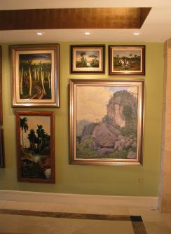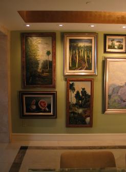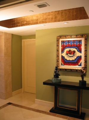 Otra técnica empleada por Grave de Peralta para darle un terminado elegante a paredes y techos es la del pan de oro (goldleaf, o gilding, en inglés). Aqui se puede apreciar el toque de distinción que le trae el oro con sus reflejos de luz, a un pasillo, resaltando un conjunto de cuadros o el brillo de un piso de mármol.