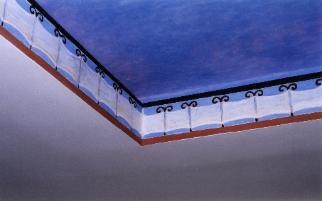 Pintura de "temple al huevo" realizada por el artista en un techo decorativo del Ocean Club en Key Biscayne. Abajo, un particular del techo, resaltando el estilo griego del motivo.