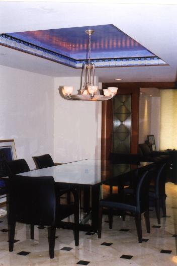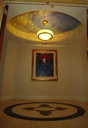 Otras imágenes de los efectos luminosos logrados con la técnica antigua de la yema de huevo. Este techo ovalado tal parece abrirse a un cielo en Key Biscayne amanecer. La cenefa que reviste el borde del espacio ovalado también es pintada.