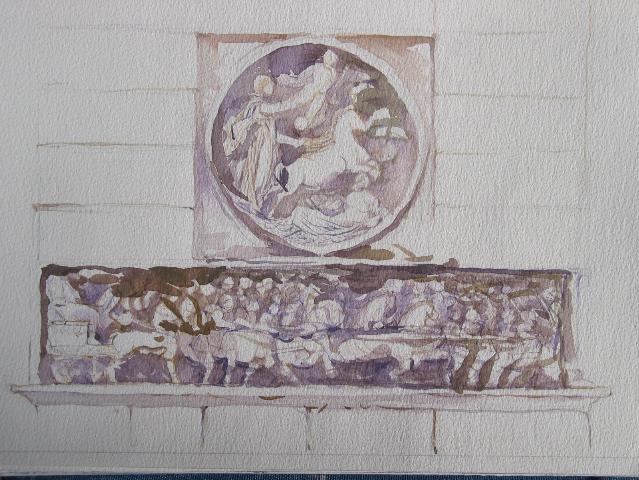 Below the medallion, in the long horizontal marble relief, we see the return of