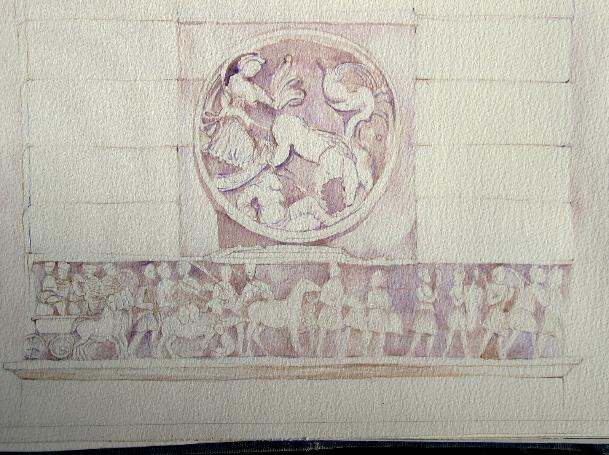 The medallion on the eastern side of the Arch, as seen in this WATERCOLOR, depicts