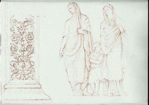 | Pencil study of the processional figures of Agrippa, Livia, and young boy, with acanthus pilaster ... (details from the south wall of the ARA PACIS) |